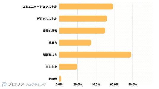 プログラミングを習わせたいと回答した人に、お子さまに身につけてほしいスキルについて尋ねた設問では、「問題解決力(課題解決のための計画を考えて実行できる力)」と回答した人がなんと7割以上にのぼりました。