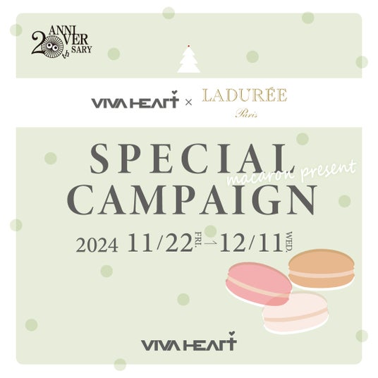 期間中VIVA HEART 直営店・オンラインストアでVIVA HEART商品を16,500円(税込)以上購入いただいた方にLADUREEマカロン引き換えチケット&LADUREEオンラインストアで使える10%オフクーポンをプレゼント!