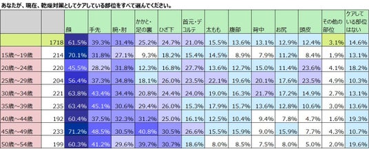 現在、乾燥対策として肌のケアをしている部位を聞きました。全体では「顔」が1位で61.5%、2位は「手先」39.3%、3位は「腕・肘」31.4%。これら以外の部位は3割未満でした。
