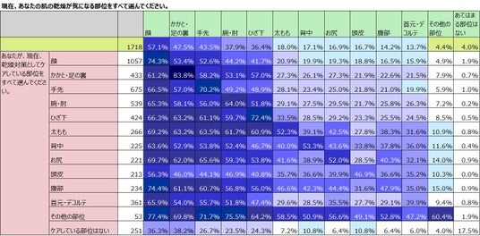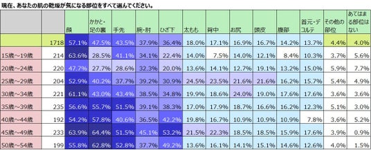 乾燥対策のボディケア、若年層は上半身・高齢層は下半身。乾燥が気になる部位で、最もケアしているのは「かかと」