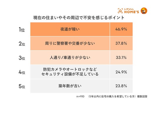 現在の住まいやその周辺について、防犯面での不安はないという人はわずか6.7%となり、9割以上の人が防犯面に何かしらの不安をおぼえていることが明らかになりました。不安を感じるポイントについては1位「夜道が暗い」(46.9%)、2位「周りに警察署や交番が少ない」(37.8%)、3位「人通り/車通りが少ない」(33.1%)となりました。