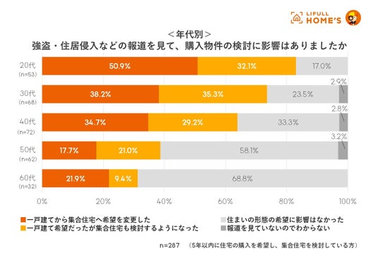 – 集合住宅購入検討者のうち、約6割が強盗住居侵入報道を受け、一戸建てから集合住宅への希望変更も検討。20代・30代の変更意向が比較的高い結果に