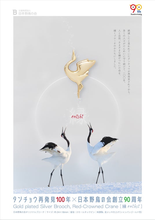 公益財団法人日本野鳥の会(事務局:東京都品川区、会長:上田 恵介、以下 日本野鳥の会)は、創立90周年である今年2024年、絶滅したと思われていたタンチョウが再発見されてから100年目を迎えたことを記念し、タンチョウがモチーフのブローチを製作しました。本日2024年11月20日(水)より、日本野鳥の会のタンチョウや自然を守る活動にご寄付をいただいた方へ、プレゼントいたします。