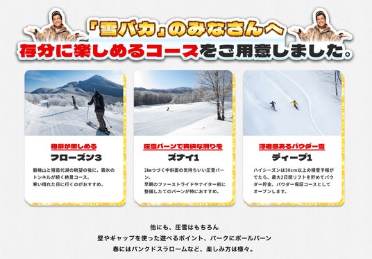 今シーズンは、北エリアに高速クワッドリフト「フレンドリーキャットエクスプレス」を新設。これにより、長さ約1km、最大幅150mの、長くて広い初心者コースが誕生します。さらにこれまで、中上級者向けのコースを通らないとアクセスできなかったエリアに、ベースから直接移動できるようになり、初級者の方が滑走できるコースが広がります。