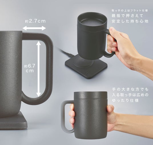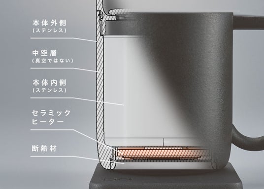 保温する秘密は、マグカップに内蔵されたセラミックヒーター。