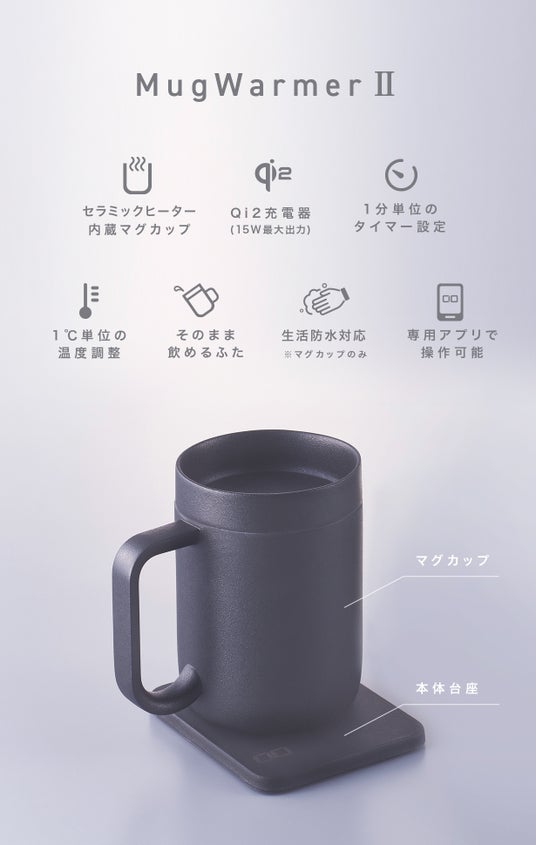 専用マグカップ内の飲み物を温めてくれる「マグウォーマー」と、スマホを置くだけでワイヤレスが充電できる「Qi2充電器」が一つになった、デスク周りの新定番「MugWarmerII」が登場!