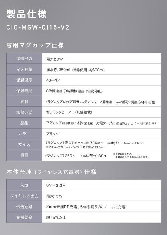 マグカップをのせる本体台座は、Qi2規格対応のワイヤレス充電器でもあります。ワイヤレスで最大15W出力の充電が可能です。