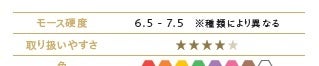 宝石図鑑のページには、モース硬度とは別に「取り扱いやすさ」という項目を設置。