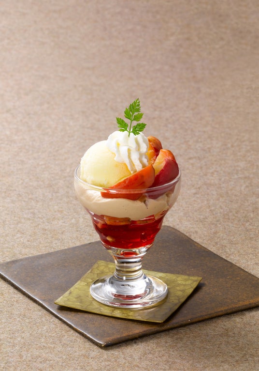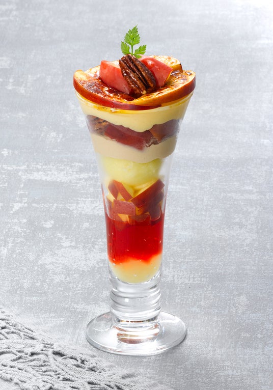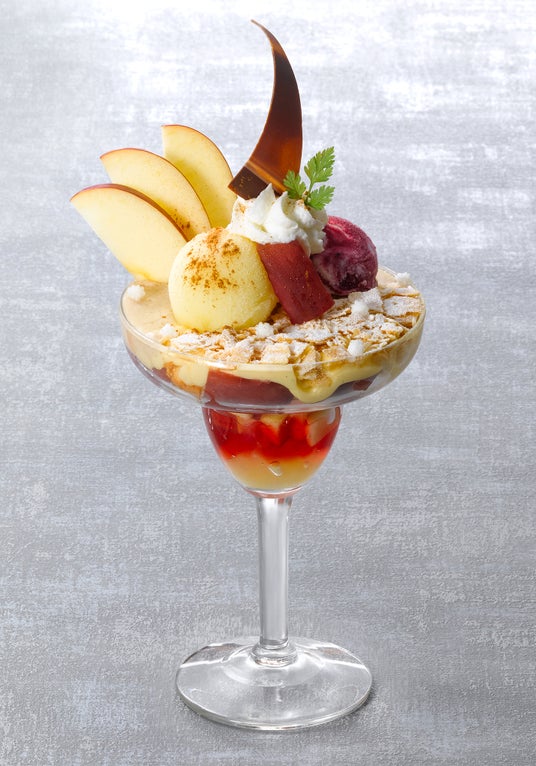 カリッとブリュレした紅玉りんごやピーカンナッツ、ミルクティークリーム、りんごのソルベ、アップルティーゼリーを重ねた様々な素材が織りなす楽しいパフェです。