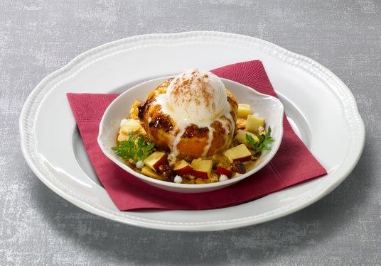 焼きりんごにピーカンナッツやシナモン香るビスケットを詰め込んで、ミルクティークリームを絞って焼き上げました。温かいクレームブリュレとアイスクリームの組み合わせや金平糖あられの食感が楽しい一品です。