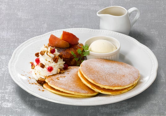 ちいさめのパンケーキに焼きりんごのクレームブリュレを添え、ピーカンナッツを散らし、シナモンパウダーをかけました。香り豊かなフレッシュりんご入りのアップルティーソースでこれまでにない食感とさわやかさを味わえます。