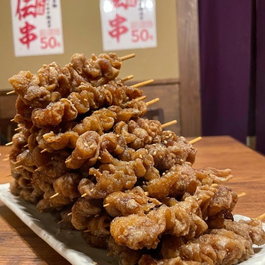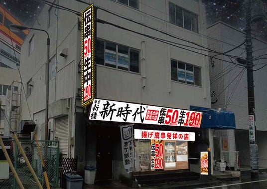 新時代は「揚げ皮串発祥」のお店。新時代の名物『伝串』は、特許庁から認められる唯一無二の大ヒット商品!そこで、並んででも食べたいというお客様が多く、連日行列ができる人気の居酒屋です。