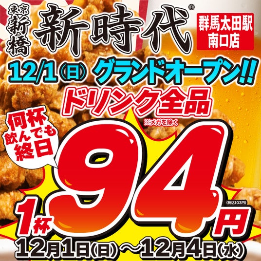 【お得に飲める絶好のチャンス!】新時代群馬太田駅南口店の新規オープンを記念して、12月1日(日)~12月4日(水)までメガ以外のドリンク全品、何杯飲んでも1杯94円(税込103円)イベントを開催いたします!