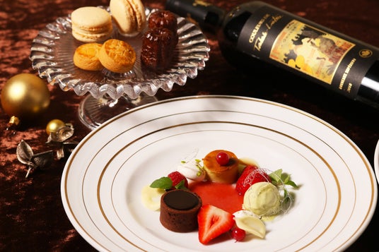 クリスマスリースに見立てた可愛らしいデザートは、味わいや食感を洗練されたバランスに仕上げました。食後は3種のプティフールをご一緒に、ゆったりとした時間をお過ごしいただけます。