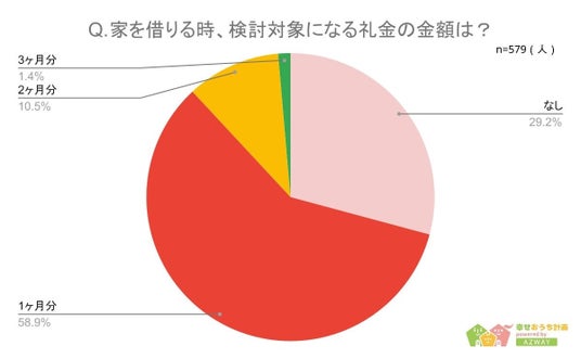 続いて、「家を借りるときに検討対象になる礼金の金額」について聞いたところ、「1ヶ月分」が1位で58.9%、「なし」が2位で29.2%、「2ヶ月分」が3位で10.5%という結果になりました。退去時に戻ってくる可能性のある敷金よりも、礼金の方が「なし」もしくは「1ヶ月分」を選んでいる人の割合が多いことがわかります。