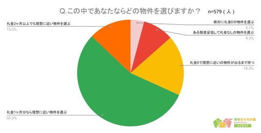 また、礼金の条件が異なる場合、どのような物件を選ぶかについて聞いてみたところ、1位は「礼金1ヶ月分なら理想に近い物件を選ぶ」が55.3%、2位は「礼金0で理想に近い物件が出るまで待つ」で18.3%、3位は「礼金2ヶ月以上でも理想に近い物件を選ぶ」で13%という結果になりました。礼金1ヶ月分であれば、理想の物件に住むために支払っても良いと考えている人が半数以上いることがわかります。