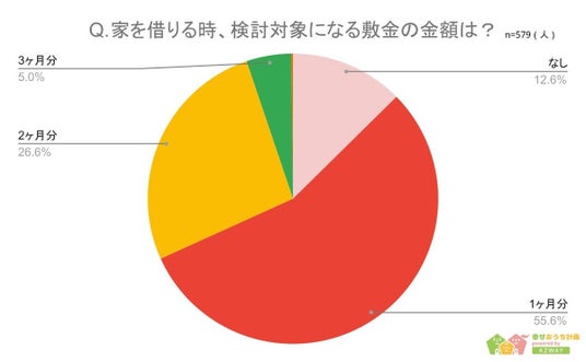 20代から60代以上までの回答者579人に「家を借りるときに検討対象になる敷金の金額」について聞いたところ、1位は「1ヶ月分」で55.6%、2位が「2ヶ月分」で26.6%、3位が「なし」で12.6%という結果になりました。敷金に対し、払うものと思っている人が8割以上いることがわかります。ただ、支払う金額については「1ヶ月分」を希望する人が多く、半数以上を占める結果となりました。