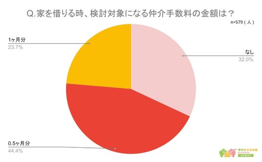 一方、仲介手数料については、「0.5ヶ月分」が1位で44.4%、「なし」が32%、「1ヶ月分」が23.7%という結果に。敷金と比べて仲介手数料については「あまり支払いたくない」もしくは「払いたくない」と考えている人が多いようです。