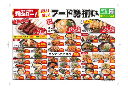 【均タローはどんな居酒屋?】お通しと席料0円(一部除く)でドリンク価格がほぼ199円と均一です。料理ラインナップは唐揚げ棒99円・焼き餃子299円を中心に食べ飲み放題2980円(税込み)も大人気です。