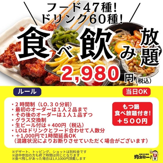 ・お通し・席料0円でドリンク199円均一で食事は名物唐揚げ棒が99円で気軽にご来店頂けます! 【食べ飲み放題は2980円でご用意】