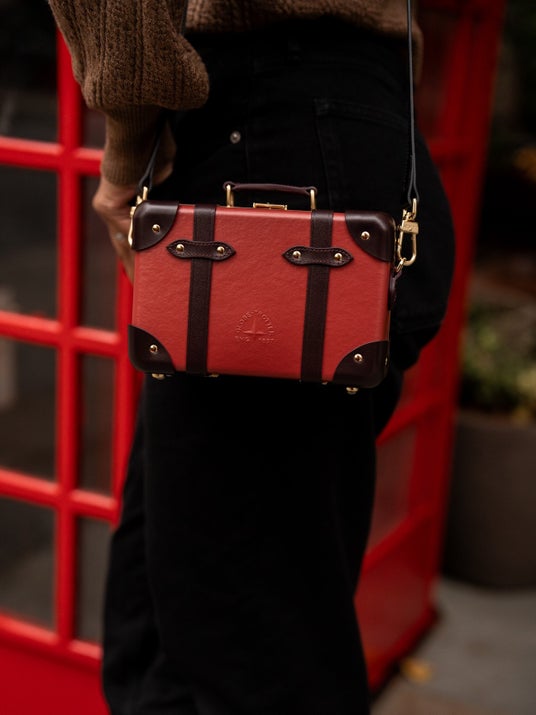 グローブ・トロッターのアイコニックなスーツケース「センテナリー」コレクションをベースに、開発されたクロスボディバッグ「メイフェアケース」。ホリデーシーズンのお出かけを彩る日本限定展開の特別カラーとして、霧の都、ロンドンの凛とした冬の空をイメージメディアムグレー、ホリデーらしい大切な人との暖かい団欒の場をイメージしたカシスレッドの2色を展開いたします。