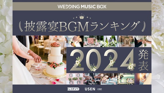 USEN&U-NEXT GROUPの株式会社USEN(本社:東京都品川区、代表取締役社長:貴舩 靖彦)と株式会社レコチョク(本社:東京都渋谷区、代表取締役社長:板橋 徹)は、協業で提供する披露宴BGMサービスパッケージ『WEDDING MUSIC BOX』で今年1年間、最も利用された楽曲の利用数を集計し、「披露宴BGMランキング2024 ~by WEDDING MUSIC BOX~」の<邦楽・洋楽 各トップ10><新郎新婦入場、乾杯、ケーキ入刀、お手紙・メッセージなどシーン別トップ3>を本日、2024年11月20日に発表したことをお知らせします。