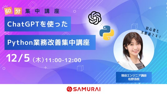プログラミングスクール「侍エンジニア」を運営する株式会社SAMURAIは、60分で生成AI×プログラミングの可能性を体感できる『ChatGPTを使ったPyhton業務改善 集中講座』を12/5(木)に無料で開講いたします。