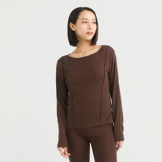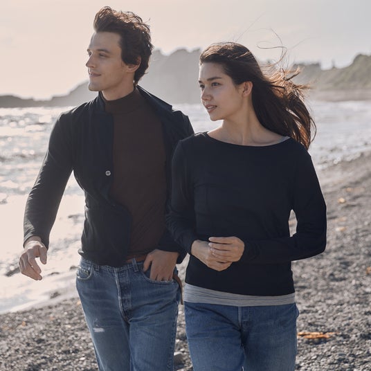 Wool Sense (左) Men モックネック長袖トップ(ブラウン)/ (右) Women 長袖トップ(ブラック)