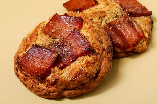 ゴロッと乗った厚切りのベーコン。夢のようなトッピングを、じっくり焼いたおっきなクッキーで。今日はカロリーを気にせずおやつでお腹いっぱいにしちゃおう。