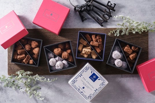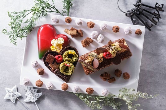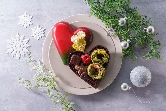4名在籍するショコラティエがイベントごとにイメージし、お客様へ手作業で届ける「クゥール ド ショコラ」。クリスマスシーズンを彩るミルクチョコレートのジンジャーマン、抹茶のおさつロシェでできたクリスマスリースをはじめ、ロゴマーク入りの定番ボンボンショコラ「ナチュール」、形がかわいい南京錠型のボンボンショコラ「シャンパンフランボワーズ」、カカオ分55%の鍵型タブレットとビターとフランボワーズのパールクラッカンの全8種類を楽しむことができるチョコレートギフトです。ホワイトチョコレートでできたお花とクリスマスベルで飾られたハート型のチョコレートでできた器もまるごと食べることができます。