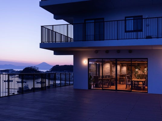 「マゼラン 湘南佐島」一般開放のレストランから続くテラス夕景