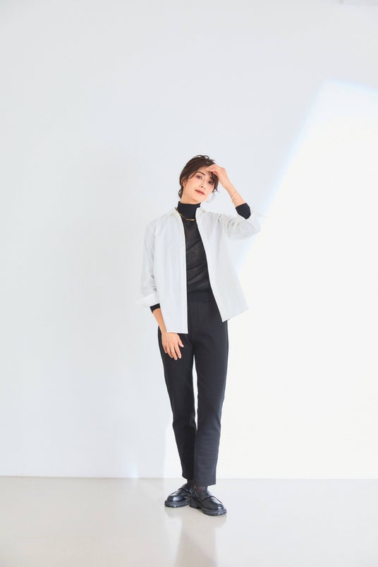 より柔和で女性らしい印象のノーカラージャケットは、ツイード素材で季節感を楽しめて、高見えするのに洗濯OK。グレーのタートルニットにさっと羽織って、同じく表情のあるウールライクのパンツを合わせれば、知的なモノトーンコーデに。