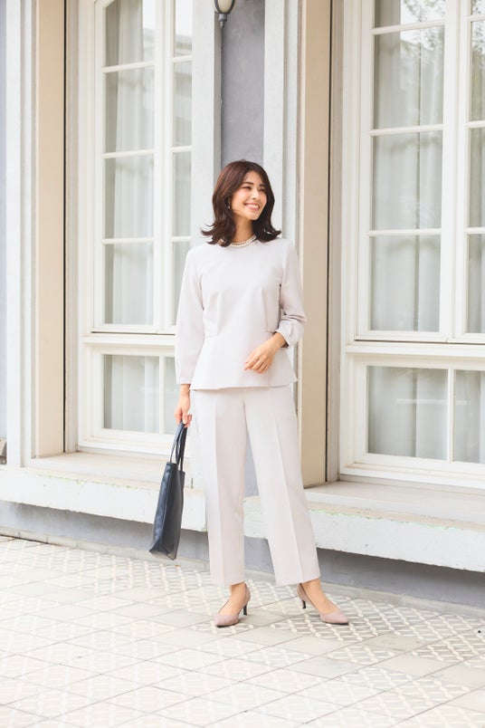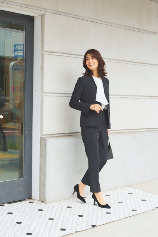 ここぞという日の勝負ジャケパンは、おうちで洗える2点セットがおすすめ。ジャケットのすっきりしたノーカラーデザインが、ブラウスのフリルとベストマッチ。きちんと見えと女性らしさを両立してくれます。