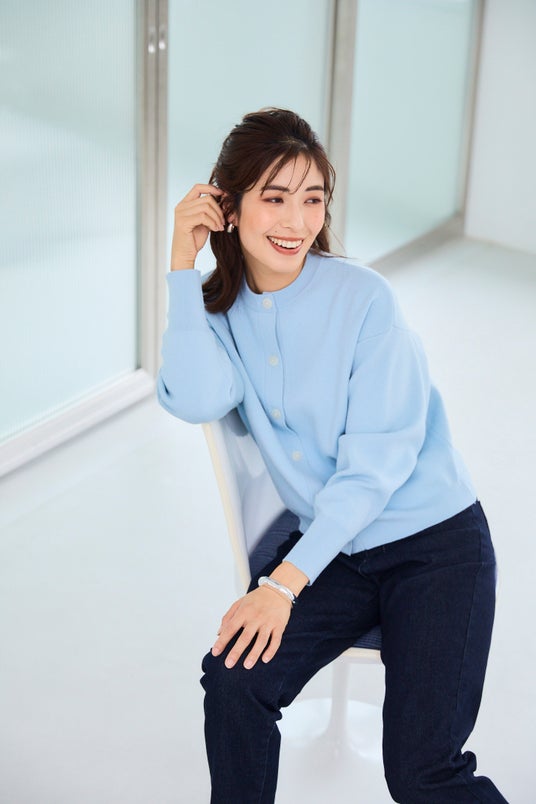 首の詰まったデザインが可愛らしいニットカーデを、ボタンをすべて留めてトップス使い。ライトブルーが顔印象をパッと明るくしてくれます。自宅で洗っても毛玉になりにくいのが嬉しいポイント。ボトムには快適なデニムをオン。