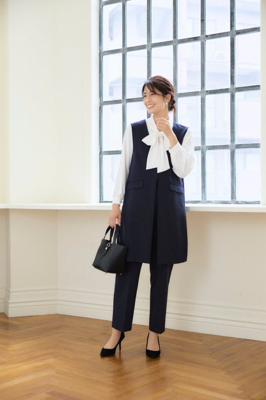 おうちで洗えてシワになりにくく、UVカット機能もついた、同素材のジレとテーパードパンツのセットに加えて、甘めニュアンスを醸すボウタイブラウスが加わった3点セット。絶対失敗しないスマートなオフィスコーデが完成。