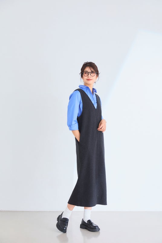 肌触りのよいウールライク素材のジャンスカを主役に、暖かくて動きやすい洗練コーデに。季節感満点で、かつ洗濯できるので、1枚持っていると重宝します。ブルーのシャツを合わせて、爽やかな印象にまとめて。