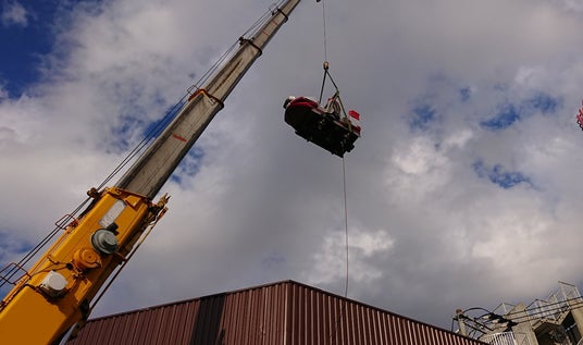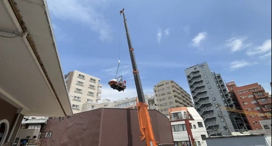 運搬時はクレーンにつられて、車体がレールから外されます。車体が浅草の空を飛ぶ様子は花やしきスタッフも心が躍る瞬間です!