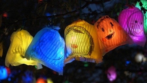 3.ひかりの実参加者が果実袋に「グラングリーン大阪をゆたかにする生き物」と笑顔を描き、中にLEDを入れて樹木に吊るす作品。一人ひとりの参加によって実現する《ひかりの実》のライトアップが、夜景を彩ります。