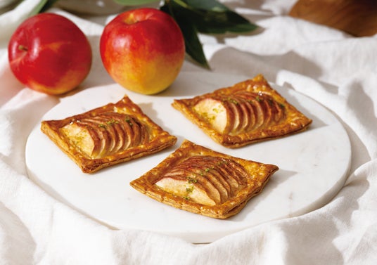 薄くスライスした青森県産りんごをのせて、サクサクに焼き上げたりんごパイ。爽やかな酸味のあるりんごとパイがマッチした、あら、りんご。1号店オープン時から人気の商品です。