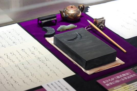 (撮影使用品)まひろ(紫式部)が藤壺で『源氏物語』を執筆するために藤原道長が用意した書道具。三日月の形が特徴的な硯、牛車の形をした筆置きなど、細部までこだわった小道具を間近でご覧ください。