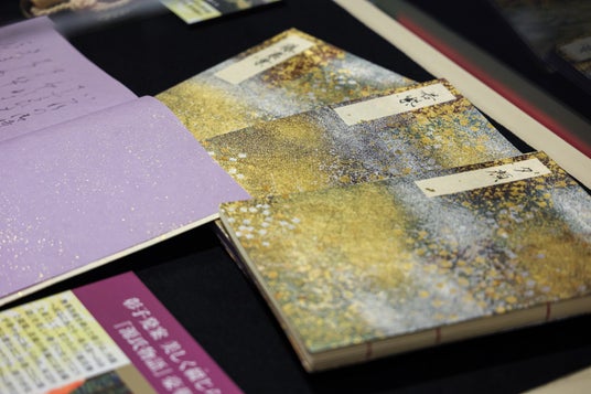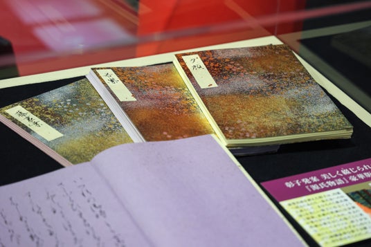 (撮影使用品)まひろ(紫式部)や彰子の手で美しく綴じられた“豪華版”『源氏物語』。巻ごとに異なる色の料紙や中に書かれた繊細な文字など、隅々までじっくりお楽しみいただけます。『源氏物語』執筆中の原稿も引き続き展示しているため、あわせてご覧ください。