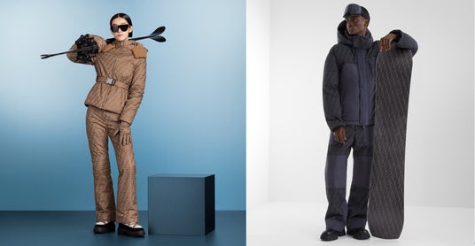 左画像:スキージャケット¥643,500、スキーパンツ¥255,200、スキーグローブ¥94,600 Credit:Daniele La Malfa 右画像:スキージャケット¥605,000、スキーパンツ¥401,500、スキーゴーグル¥108,900、スノーボード¥1,001,000 Credit:Courtesy of FENDI(すべて税込み)