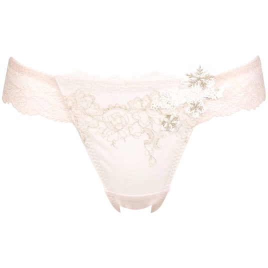 モチーフが揺れる箇所をつくったり、背面にも配置したりすることで実際に雪が降っているように見せることにもこだわりました。また、本来は六角形である雪の結晶を五角形にデザインすることで、桜や星空にも見えるので、シーズンを限定せず、年中訪れる「もっと素敵でいたい日」に身につける、お守りのようなランジェリーにしてほしいですね。