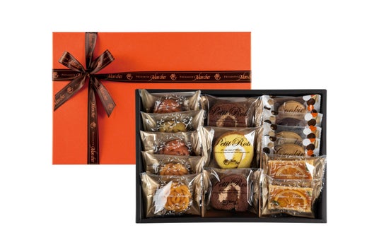 ぱっと目を引くほど鮮やかなオレンジ色のボックスとブラウンのリボンは、モンシェールを象徴するパッケージです。中にはシェフがこだわって焼き上げた自信作ばかりを詰め合わせました。