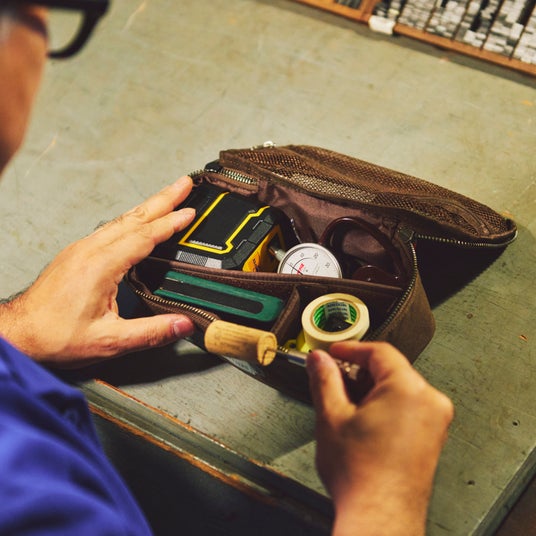アートディレクターの細山田光宣さんとコラボレーションした「Printers Drawer(large / small)」は、プリンターズ・ドロワーという活版印刷のための活字を入れるひきだしからイメージを膨らませて作ったポーチです。上部に持ち手のついた横長の工具箱のようなフォルムで、サイズは2種類。内部の仕切りは面ファスナーで着脱できるので、好きなところにつけたり外したり、入れる物に合わせてカスタマイズができます。ふたの裏側はメッシュポケットになっています。生地は蝋引き加工がほどこされた撥水性のあるコットン素材で、引き手のオレンジ色がアクセントになっています。