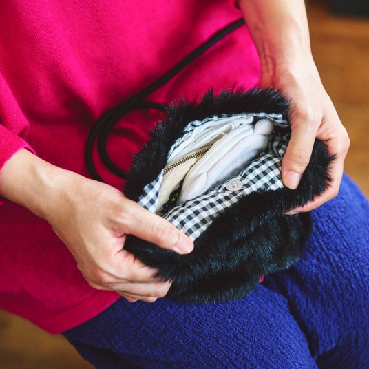 アーティストの堀口尚子さんとのコラボレーションからは、黒猫の顔の形がかわいい、肩から下げられるポシェットタイプのポーチが生まれました。生地は、なでていたくなるようなふわふわとしたフェイクファー素材で、ポーチ内側には黒と白のギンガムチェック柄の生地を合わせました。猫の口からちょろっと出ているビビッドピンクの「舌」の部分は、実は、ポーチに収納されたエコバッグ。舌をシュッと引っ張ることで、エコバッグを取り出せます。外出先で荷物が増えたときにもさっと取り出して使えるので便利です。肩ひもは金具で取り付けられているため、自由に取り外して使えます。