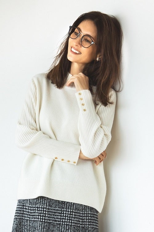 ゲージ&リブコンビのコントラストがリッチなニットです。ボディはしっかりめ、袖は細く見える様に薄めに、ややコンパクトなサイズ感とスタイルアップして見えるバランスにこだわりました。背中にシームライン、袖口には金釦でさりげない華やかさをプラスしています。