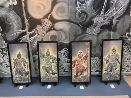 片岡鶴太郎氏作「龍襖絵・四天王額」「紅葉三連作」展示