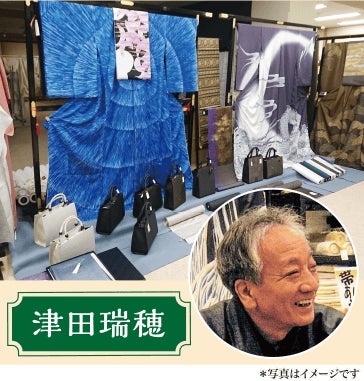 津田瑞穂先生来場(11月29日~12月2日限定)片岡鶴太郎氏の絵の師匠であり染色家の津田瑞穂氏は、高い技術と芸術性を兼ね備えた作家で、着物業界を中心に活動されており、その作品は多くの人々を魅了しています。