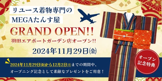 新たな挑戦 – 羽田空港に「MEGAたんす屋」オープンこの度、リユース着物たんす屋から誕生した新ブランド「MEGAたんす屋」が、羽田第三ターミナル直結の羽田エアポートガーデンに新たな店舗をオープンします。羽田空港は、インバウンド需要に対応するため、数多くの日本文化体験スポットを擁する国際的な玄関口であり、世界中の旅行者に日本の伝統文化を発信する絶好の場です。